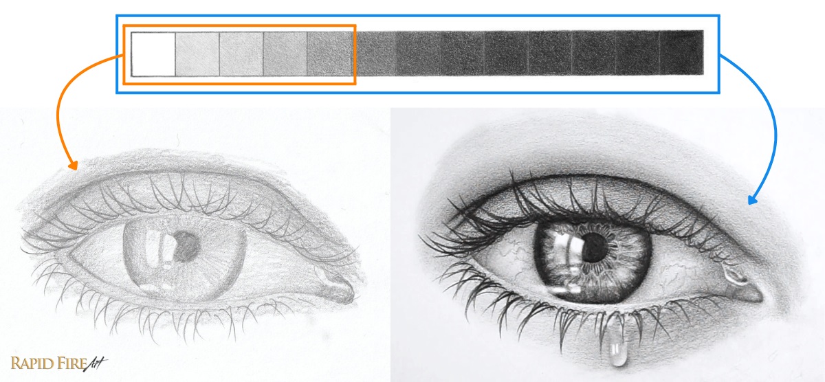 - Use a full range of values from light grays to deep blacks. This contrast is what gives the eye that “alive” look.