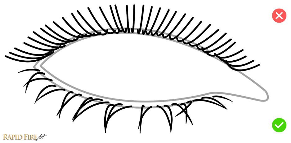 Drawing lashes as stiff, evenly spaced spikes that form a predictable pattern can instantly break realism. In reality, lashes are messy, can overlap each other and sometimes point in an unpredictable direction.