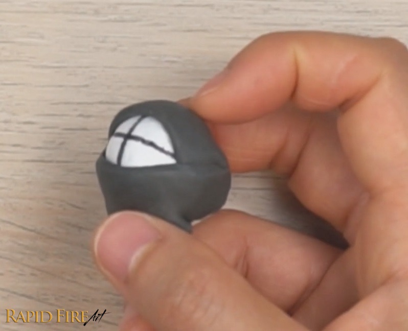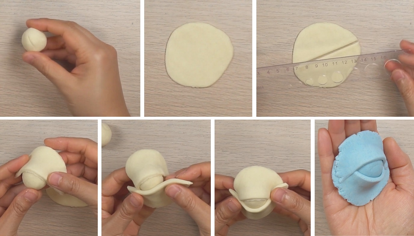 - Create the Eyelids: Roll another ball around the same size as the first one and flatten it down (don’t make it too thin or else it will be difficult to peel off your work surface. 3mm to 4mm worked nicely for me). Cut it in half using a straight edge such as a ruler or butterknife. These halves will be the top and bottom eyelids.