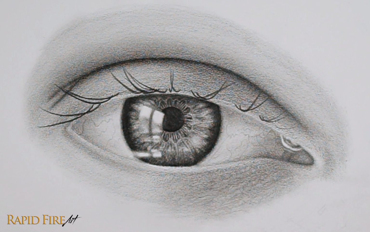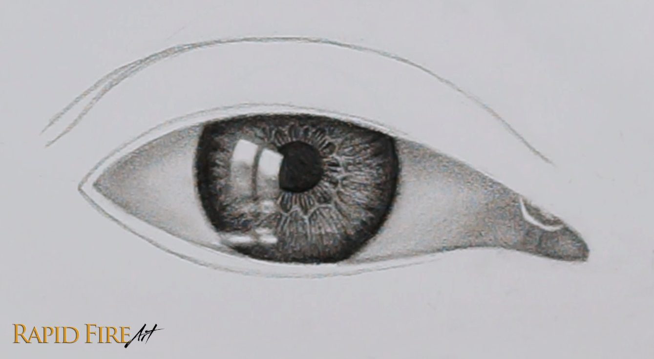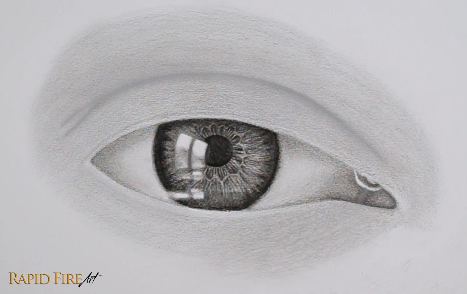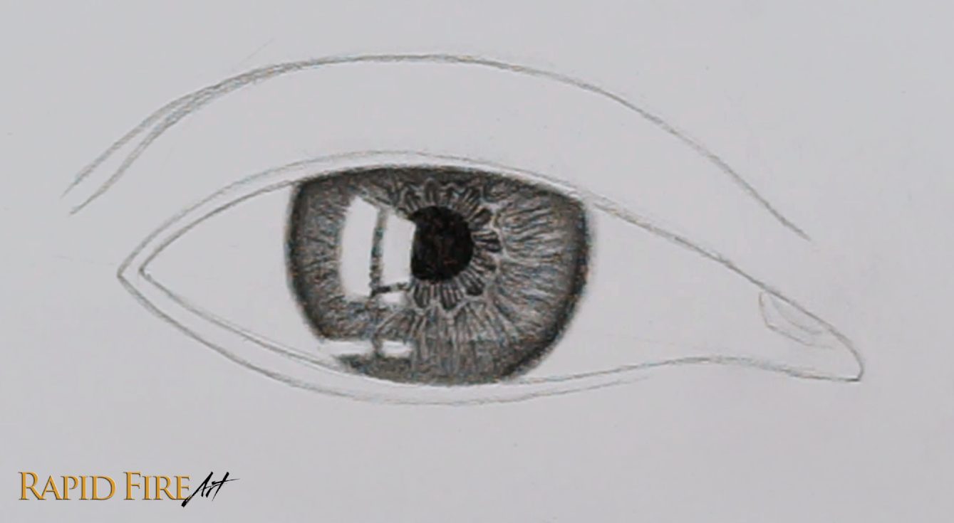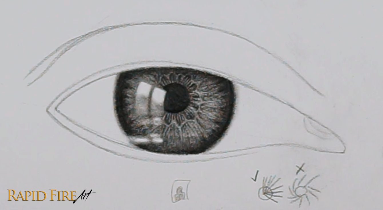 You can increase contrast further by darkening the edge of your iris and the cast shadow along the top using a 6B pencil.
