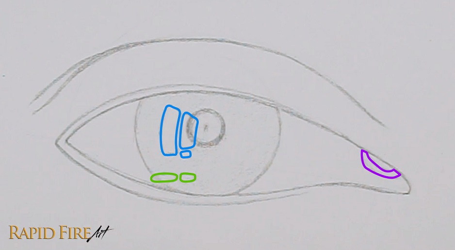 Waterline Highlights: Outlined in green, these two shapes are a squished version of the Main Highlights. I’m calling them Waterline Highlights because they are going to sit at the edge of some accumulated tears at the bottom of the eye, and we want these tears to glisten!