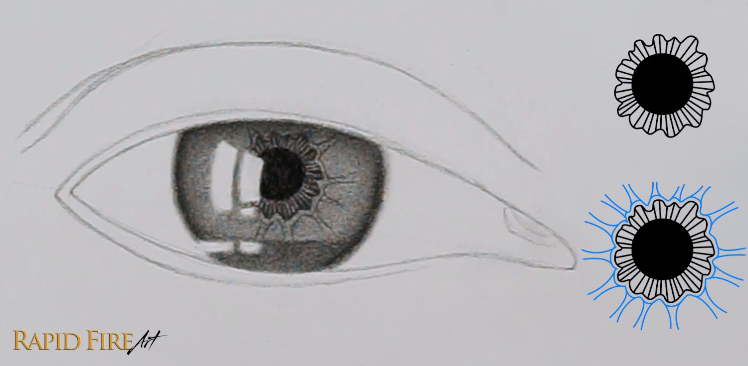Within the ribbon that surrounds your pupil, draw a bunch of radiating lines. Then draw another identical ribbon around the first one. Where the ribbon juts out, draw lines that reach outward toward the edge of the iris.