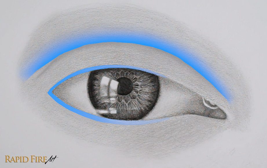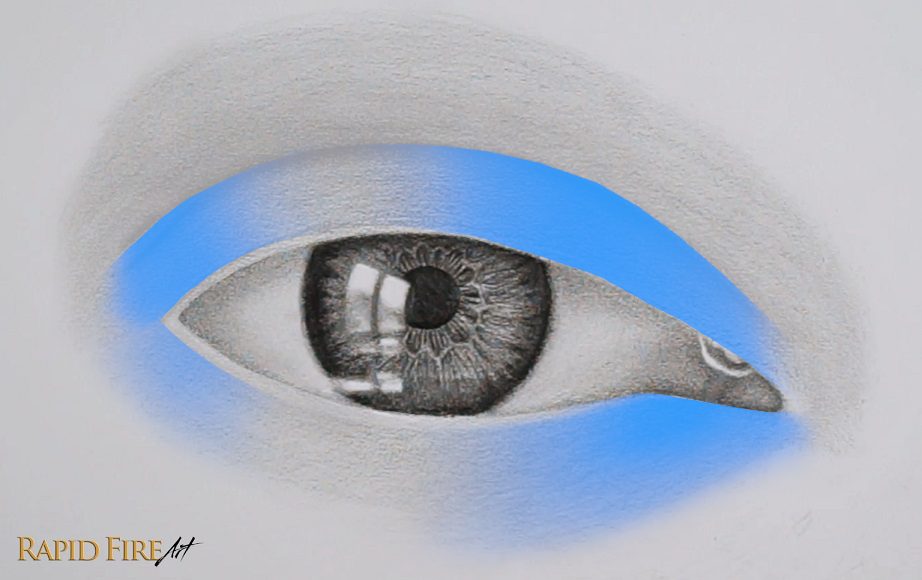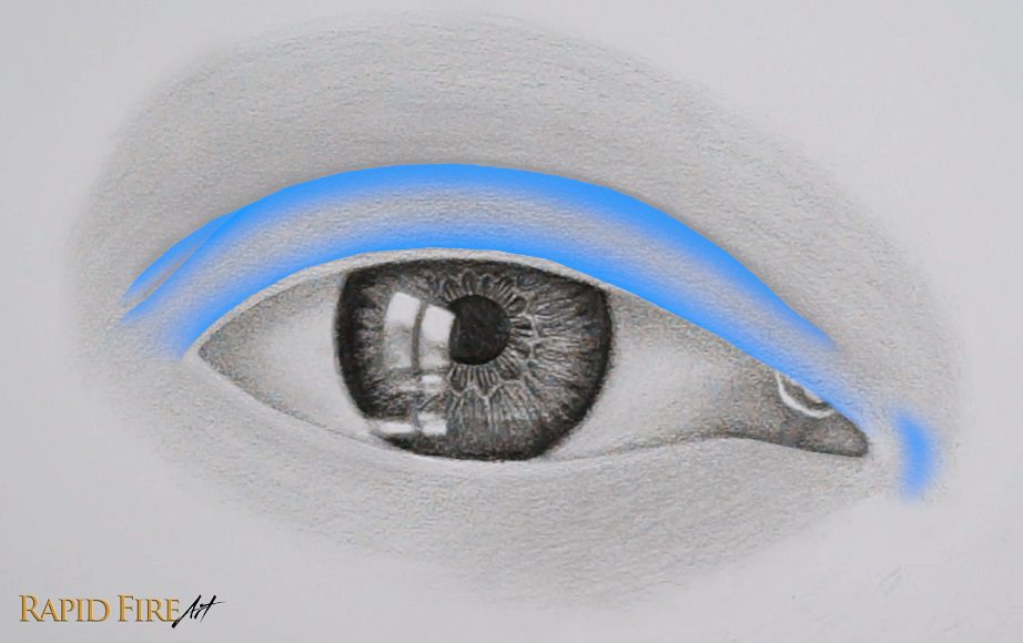 Then, for all the areas highlighted in blue below, shade darker to make the skin appear curved. Lighten your strokes gradually as you approach areas where the skin should be lighter. Shade the eyelid crease the darkest.
