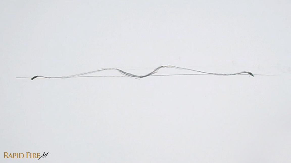 Start by drawing a long horizontal line across your page. In the middle, draw a shallow “U” shape. On each side, draw the corners of the mouth using little tick marks. Make sure they are spaced evenly apart.