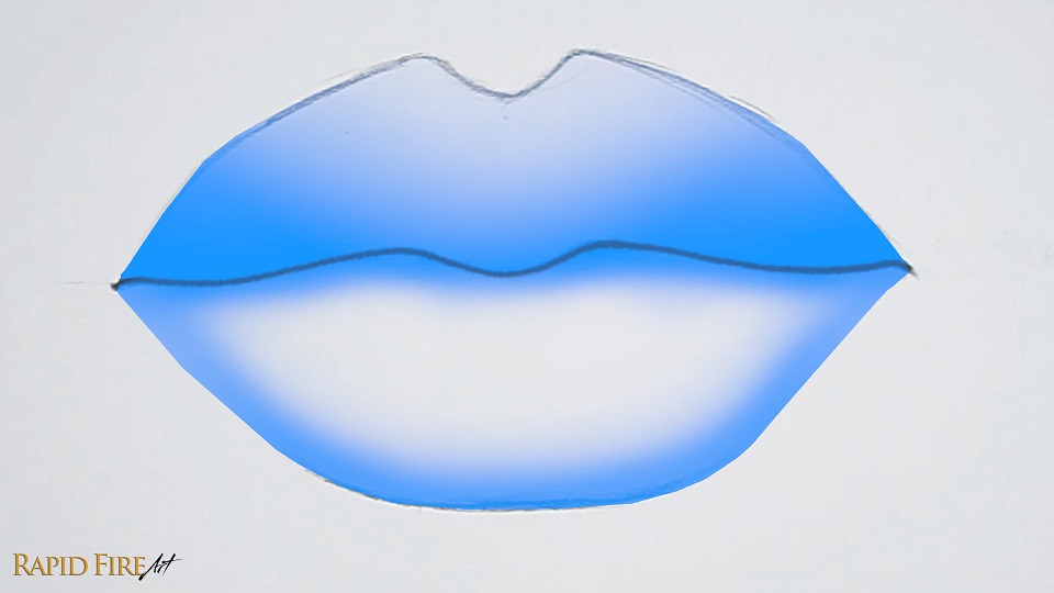 My imaginary light source is shining down from the top left. So I will shade the areas highlighted in blue a little bit darker to give the lips some shape. We will be shading them even more later.