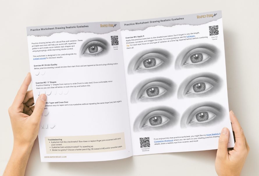Once you’ve got your worksheets, print them and head back to the tutorial to see how to put these tips into practice and get step-by-step guidance on drawing realistic lashes: [Go to Eyelash Tutorial]